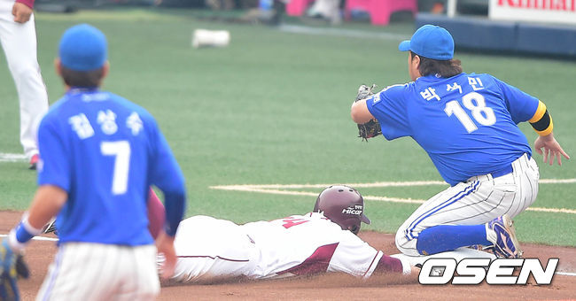 1회말 넥센 공격 1사 2루 유한준 타석 때 서건창이 3루 도루에 성공하고 있다.