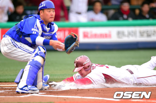 8일 오후 서울 목동야구장에서 열린 '2014 한국야쿠르트 세븐 프로야구 포스트시즌' 넥센 히어로즈와 삼성 라이온즈의 한국시리즈 4차전, 1회말 2사 2루 넥센 강정호의 내야땅볼때 2루 주자 박병호가 실책을 틈타 득점을 올리고 있다.