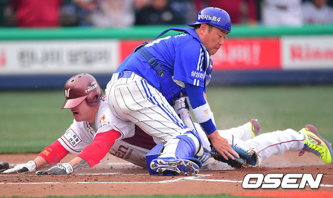 8일 오후 서울 목동야구장에서 열린 '2014 한국야쿠르트 세븐 프로야구 포스트시즌' 넥센 히어로즈와 삼성 라이온즈의 한국시리즈 4차전, 1회말 2사 2루 넥센 강정호의 내야땅볼때 2루 주자 박병호가 실책을 틈타 득점을 올리고 있다.