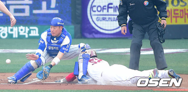 1회말 넥센 공격 2사 2루 상황 강정호의 내야 땅볼 때 삼성 내야진의 실책을 틈타 주자 박병호가 홈까지 내달려 세이프되고 있다.