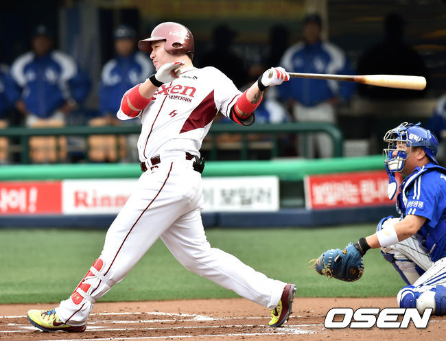8일 오후 서울 목동야구장에서 열린 '2014 한국야쿠르트 세븐 프로야구 포스트시즌' 넥센 히어로즈와 삼성 라이온즈의 한국시리즈 4차전, 1회말 2사 박병호가 2루타를 치고 있다.