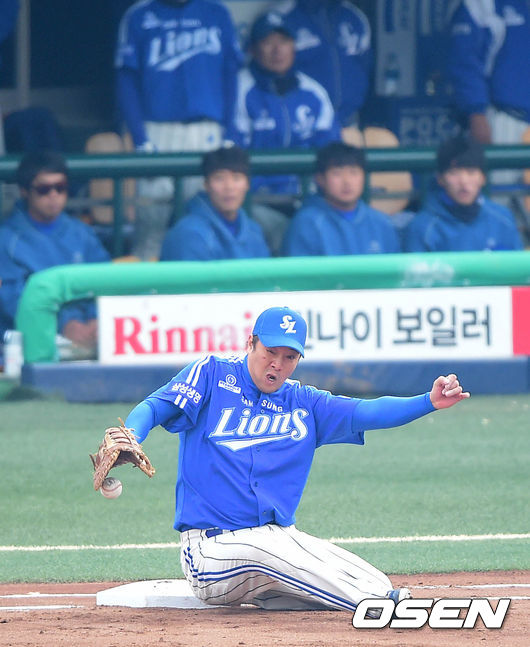 1회말 넥센 공격 2사 2루 상황 강정호의 내야 땅볼 때 삼성 1루수 채태인이 3루수 박석민의 송구를 놓치고 있다.