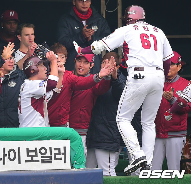 8일 오후 서울 목동야구장에서 열린 '2014 한국야쿠르트 세븐 프로야구 포스트시즌' 넥센 히어로즈와 삼성 라이온즈의 한국시리즈 4차전, 1회말 1사 3루 넥센 유한준의 희생플라이때 선취점을 올린 3루 주자 서건창이 유한준과 하이파이브를 하고 있다