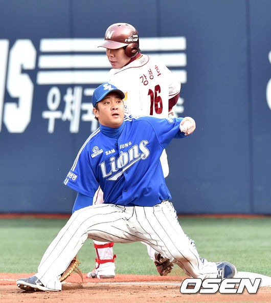 8일 오후 서울 목동야구장에서 열린 '2014 한국야쿠르트 세븐 프로야구 포스트시즌' 넥센 히어로즈와 삼성 라이온즈의 한국시리즈 4차전, 1회말 2사 2루 강정호의 타구를 삼성 3루수 박석민이 1루에 악송구 세이프 되고 있다, 이름 틈 타 박병호가 홈을 파고들어 세이프.