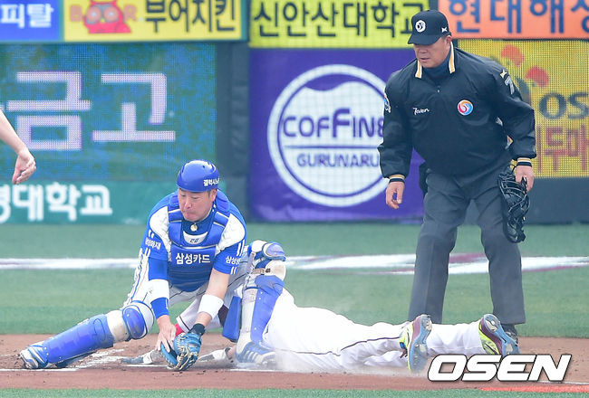 1회말 넥센 공격 2사 2루 상황 강정호의 내야 땅볼 때 삼성 내야진의 실책을 틈타 주자 박병호가 홈까지 쇄도해 세이프 되고 있다.