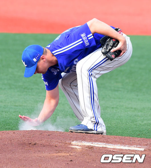 8일 오후 서울 목동야구장에서 열린 '2014 한국야쿠르트 세븐 프로야구 포스트시즌' 넥센 히어로즈와 삼성 라이온즈의 한국시리즈 4차전, 1회말 2실점을 허용한 삼성 마틴이 로진을 손에 바르고 있다.