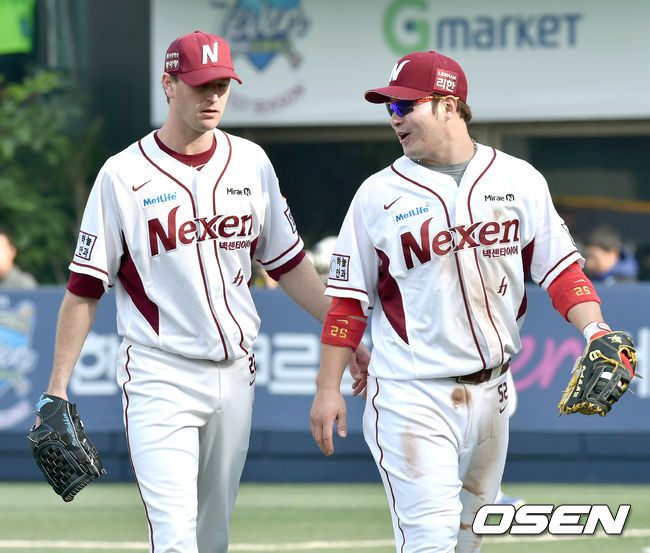 8일 오후 서울 목동야구장에서 열린 '2014 한국야쿠르트 세븐 프로야구 포스트시즌' 넥센 히어로즈와 삼성 라이온즈의 한국시리즈 4차전, 2회초 수비를 삼자범퇴로 마무리 한 밴헤켄이 박병호와 밝은 표정으로 이야기를 나누고 있다.