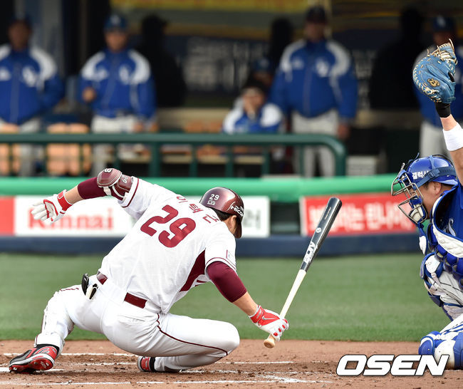 8일 오후 서울 목동야구장에서 열린 '2014 한국야쿠르트 세븐 프로야구 포스트시즌' 넥센 히어로즈와 삼성 라이온즈의 한국시리즈 4차전,2회말 1사 1,2루 배영수의 투구가 이택근 머리로 향해 화들짝 놀라고 있다.