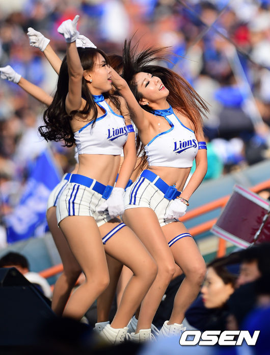 8일 오후 서울 목동야구장에서 열린 '2014 한국야쿠르트 세븐 프로야구 포스트시즌' 넥센 히어로즈와 삼성 라이온즈의 한국시리즈 4차전, 삼성 치어리더가 열띤 응원을 하고 있다.