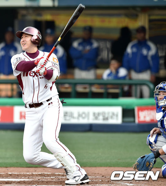 8일 오후 서울 목동야구장에서 열린 '2014 한국야쿠르트 세븐 프로야구 포스트시즌' 넥센 히어로즈와 삼성 라이온즈의 한국시리즈 4차전,2회말 2사 2,3루 유한준이 스리런 홈런을 치고 있다.