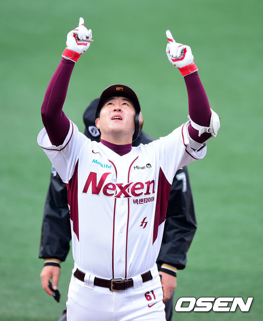 8일 오후 서울 목동야구장에서 열린 '2014 한국야쿠르트 세븐 프로야구 포스트시즌' 넥센 히어로즈와 삼성 라이온즈의 한국시리즈 4차전, 2회말 2사 2,3루에서 넥센 유한준이 스리런포를 날리고 세리머니를 하고 있다.