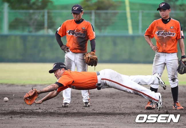 8일 일본 오키나와 고친다 구장에서 한화 이글스 2014 마무리 캠프가 진행됐다. 정근우가 오후 펑고 훈련때 몸을 날리고 있다.