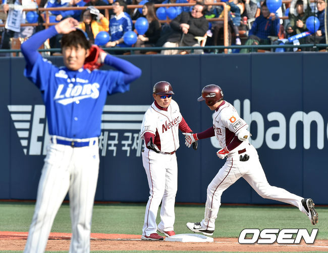 8일 오후 서울 목동야구장에서 열린 '2014 한국야쿠르트 세븐 프로야구 포스트시즌' 넥센 히어로즈와 삼성 라이온즈의 한국시리즈 4차전,2회말 2사 2,3루 유한준이 스리런 홈런을 치고 베이스를 돌고 있다.