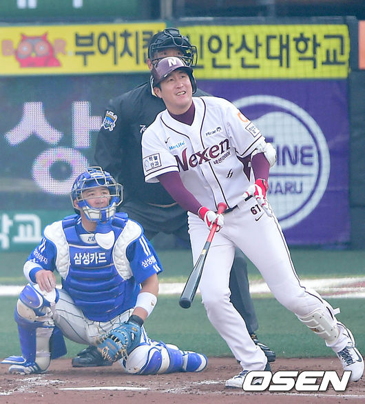 2회말 넥센 공격 2사 2, 3루 상황 유한준이 삼성 투수 배영수를 상대로 좌월 스리런포를 날리고 타구를 바라보고 있다.