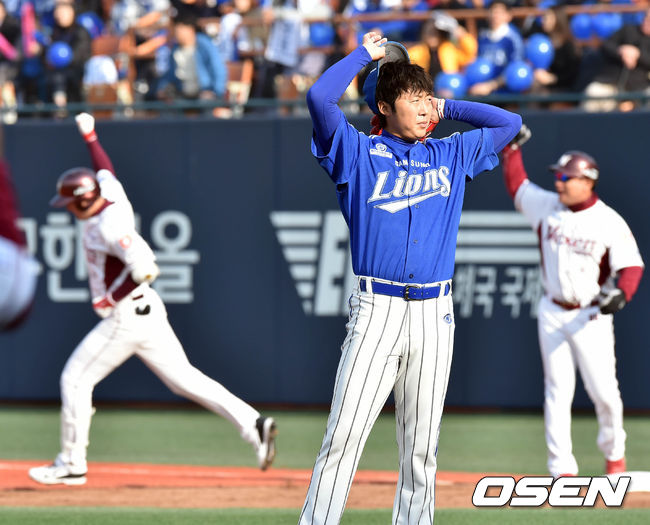 8일 오후 서울 목동야구장에서 열린 '2014 한국야쿠르트 세븐 프로야구 포스트시즌' 넥센 히어로즈와 삼성 라이온즈의 한국시리즈 4차전,2회말 2사 2,3루 유한준에 스리런 홈런을 맞은 배영수가 아쉬워하고 있다.