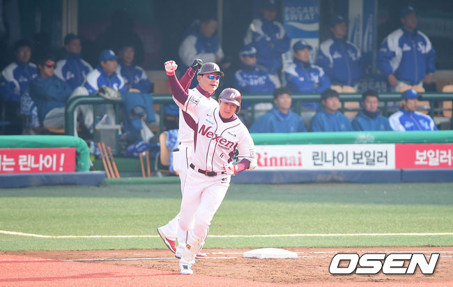 2회말 넥센 공격 2사 2, 3루 상황 유한준이 삼성 투수 배영수를 상대로 좌월 스리런포를 날리고 주먹을 불끈 쥐며 그라운드를 돌고 있다.