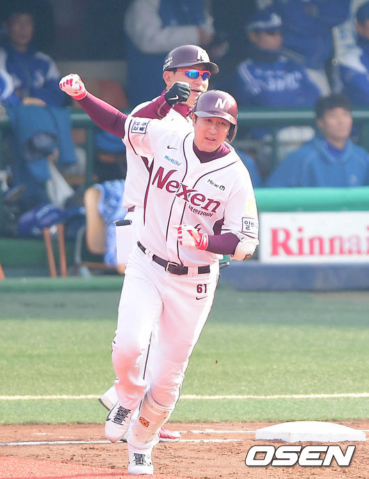 2회말 넥센 공격 2사 2, 3루 상황 유한준이 삼성 투수 배영수를 상대로 좌월 스리런포를 날리고 그라운드를 돌며 주먹을 불끈 쥐고 있다.