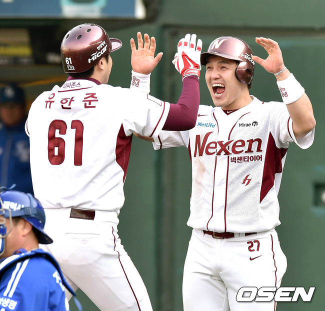 8일 오후 서울 목동야구장에서 열린 '2014 한국야쿠르트 세븐 프로야구 포스트시즌' 넥센 히어로즈와 삼성 라이온즈의 한국시리즈 4차전,2회말 2사 2,3루 유한준이 스리런 홈런을 치고 환호하고 있다.