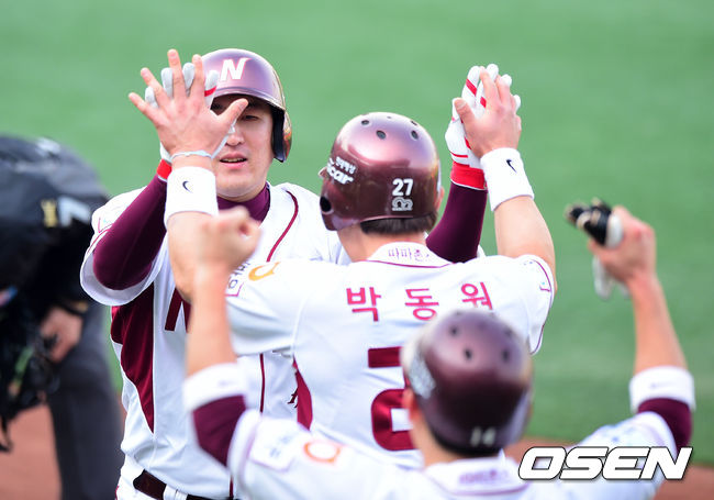 8일 오후 서울 목동야구장에서 열린 '2014 한국야쿠르트 세븐 프로야구 포스트시즌' 넥센 히어로즈와 삼성 라이온즈의 한국시리즈 4차전, 2회말 2사 2,3루에서 넥센 유한준이 스리런포를 날리고 홈을 밟으며 기뻐하고 있다.