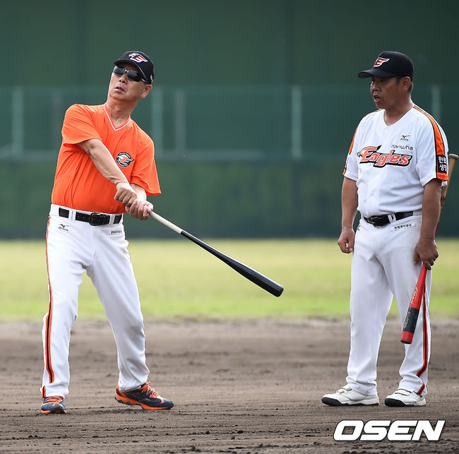 8일 일본 오키나와 고친다 구장에서 한화 이글스 2014 마무리 캠프가 진행됐다. 김성근 감독이 쇼다 타격 코치와 스윙에 대해 얘기를 스윙 포즈를 취하고 있다.