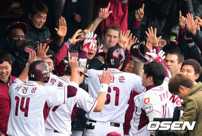 8일 오후 서울 목동야구장에서 열린 '2014 한국야쿠르트 세븐 프로야구 포스트시즌' 넥센 히어로즈와 삼성 라이온즈의 한국시리즈 4차전, 2회말 2사 2,3루에서 넥센 유한준이 스리런포를 날리고 더그아웃에서 동료선수들과 기뻐하고 있다.