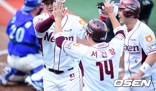 8일 오후 서울 목동야구장에서 열린 '2014 한국야쿠르트 세븐 프로야구 포스트시즌' 넥센 히어로즈와 삼성 라이온즈의 한국시리즈 4차전, 2회말 2사 2,3루에서 넥센 유한준이 스리런포를 날리고 서건창, 박동원과 기뻐하고 있다.