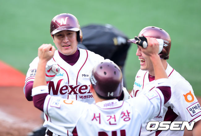 8일 오후 서울 목동야구장에서 열린 '2014 한국야쿠르트 세븐 프로야구 포스트시즌' 넥센 히어로즈와 삼성 라이온즈의 한국시리즈 4차전, 2회말 2사 2,3루에서 넥센 유한준이 스리런포를 날리고 서건창, 박동원과 기뻐하고 있다.