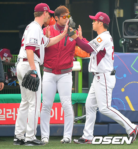8일 오후 서울 목동야구장에서 열린 '2014 한국야쿠르트 세븐 프로야구 포스트시즌' 넥센 히어로즈와 삼성 라이온즈의 한국시리즈 4차전,4회초 2사 삼성 채태인의 타구를 넥센 이택근 중견수가 펜스 앞에서 잡았다. 밴헤켄이 이택근과 하이파이브를 하고 있다.