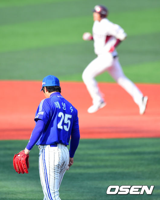 8일 오후 서울 목동야구장에서 열린 '2014 한국야쿠르트 세븐 프로야구 포스트시즌' 넥센 히어로즈와 삼성 라이온즈의 한국시리즈 4차전, 2회말 2사 2,3루에서 삼성 배영수가 넥센 유한준에 스리런포를 허용하며 아쉬워하고 있다.