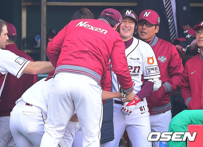 8일 오후 서울 목동야구장에서 열린 '2014 한국야쿠르트 세븐 프로야구 포스트시즌' 넥센 히어로즈와 삼성 라이온즈의 한국시리즈 4차전,2회말 2사 1,2루 넥센 유한준이 3점 홈런을 날리고 동료들의 축하를 받고 있다.
