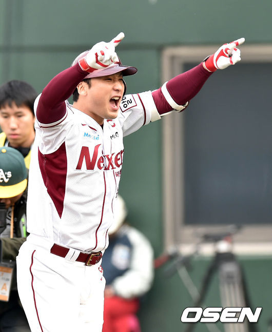 8일 오후 서울 목동야구장에서 열린 '2014 한국야쿠르트 세븐 프로야구 포스트시즌' 넥센 히어로즈와 삼성 라이온즈의 한국시리즈 4차전,4회말 2사 1루 이택근이 투런 홈런을 치고 환호하고 있다.
