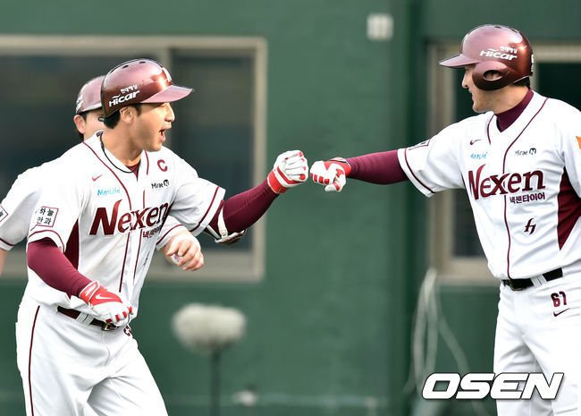8일 오후 서울 목동야구장에서 열린 '2014 한국야쿠르트 세븐 프로야구 포스트시즌' 넥센 히어로즈와 삼성 라이온즈의 한국시리즈 4차전,4회말 2사 1루 이택근이 투런 홈런을 치고 환호하고 있다.