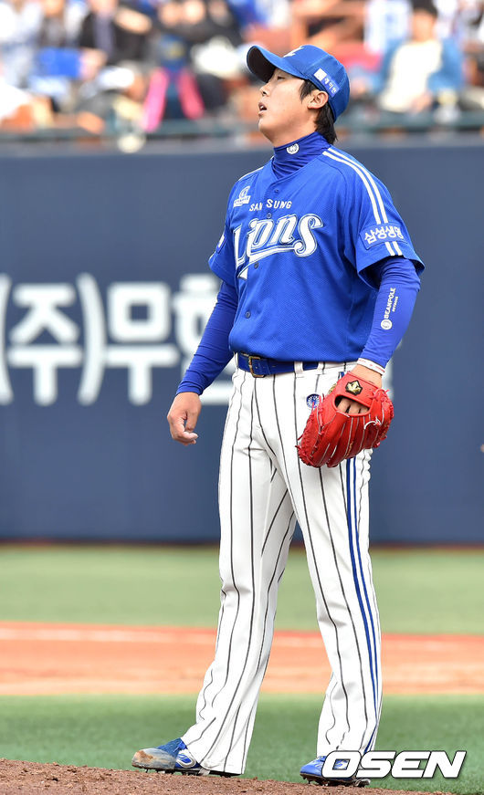 8일 오후 서울 목동야구장에서 열린 '2014 한국야쿠르트 세븐 프로야구 포스트시즌' 넥센 히어로즈와 삼성 라이온즈의 한국시리즈 4차전,4회말 2사 1루 이택근에 투런 홈런을 맞은 배영수가 타구를 바라보고 있다.