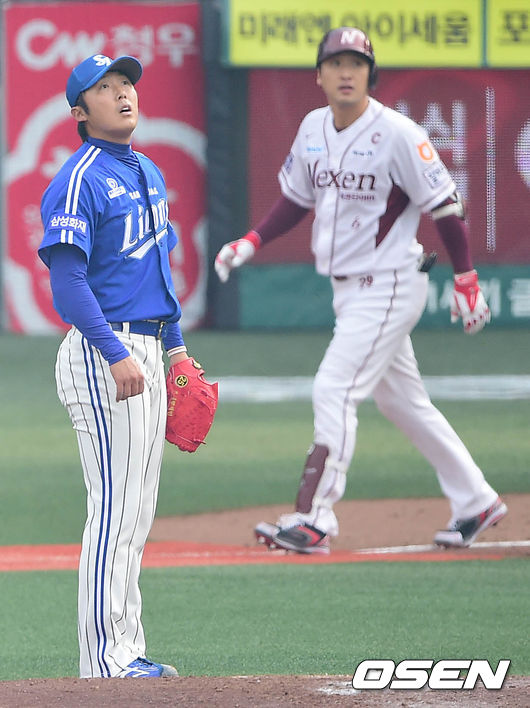 4회말 넥센 공격 2사 1루 상황 이택근에게 달아나는 좌월 투런포를 허용한 삼성 투수 배영수가 아쉬워하고 있다.