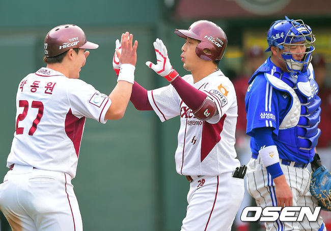 8일 오후 서울 목동야구장에서 열린 '2014 한국야쿠르트 세븐 프로야구 포스트시즌' 넥센 히어로즈와 삼성 라이온즈의 한국시리즈 4차전,4회말 2사 1루 넥센 이택근이 2점 홈런을 날리고 박동원과 하이파이브를 하고 있다.