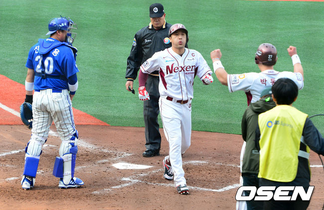 8일 오후 서울 목동야구장에서 열린 '2014 한국야쿠르트 세븐 프로야구 포스트시즌' 넥센 히어로즈와 삼성 라이온즈의 한국시리즈 4차전, 4회말 2사 1루에서 넥센 이택근이 투런포를 날리고 홈을 밟고 있다.