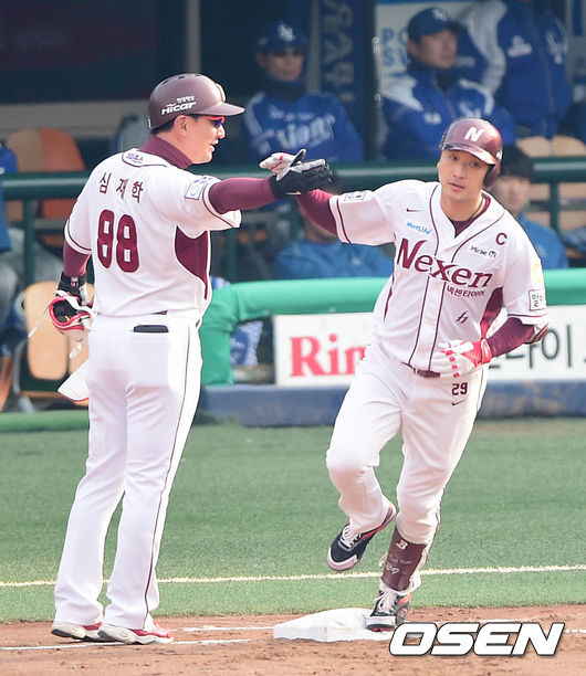 4회말 넥센 공격 2사 1루 상황 이택근이 달아나는 좌월 투런포를 터트리고 심재학 코치와 하이파이브를 나누며 그라운드를 돌고 있다.