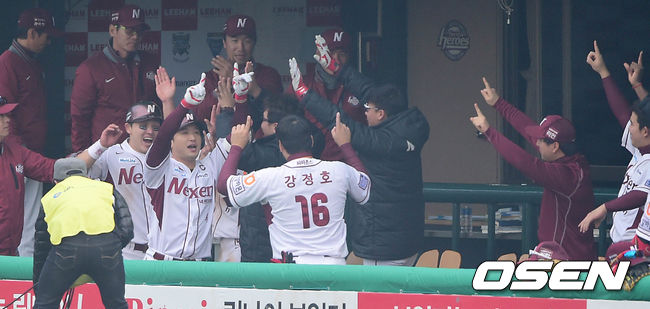4회말 넥센 공격 2사 1루 상황 이택근이 삼성 투수 배영수를 상대로 달아나는 좌월 투런포를 터트리고 더그아웃 동료들과 인사를 나누고 있다.