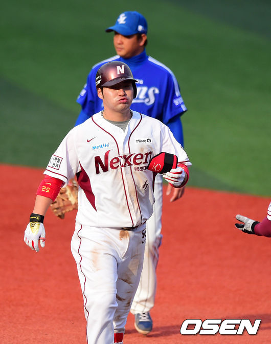 8일 오후 서울 목동야구장에서 열린 '2014 한국야쿠르트 세븐 프로야구 포스트시즌' 넥센 히어로즈와 삼성 라이온즈의 한국시리즈 4차전, 5회말 무사에서 넥센 박병호가 좌전안타를 날리고 기뻐하고 있다.