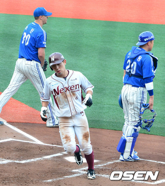 8일 오후 서울 목동야구장에서 열린 '2014 한국야쿠르트 세븐 프로야구 포스트시즌' 넥센 히어로즈와 삼성 라이온즈의 한국시리즈 4차전, 1회말 1사 3루에서 넥센 서건창이 유한준의 희생플라이에 태그업, 선취득점에 성공하고 있다.