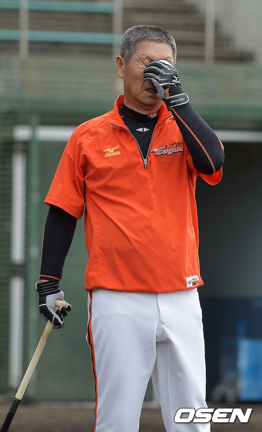 8일 일본 오키나와 고친다 구장에서 한화 이글스 2014 마무리 캠프가 진행됐다. 김성근 감독이 펑고를 치던 중 답답한 표정을 짓고 있다.