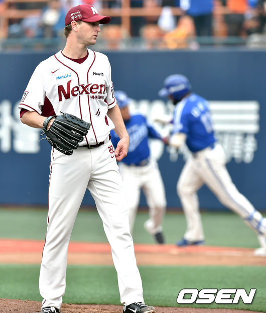 8일 오후 서울 목동야구장에서 열린 '2014 한국야쿠르트 세븐 프로야구 포스트시즌' 넥센 히어로즈와 삼성 라이온즈의 한국시리즈 4차전,7회초 무사 밴헤켄이 나바로에 홈런을 맞아 퍼펙트가 깨지고 아쉬워하고 있다.