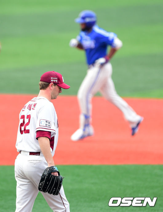 8일 오후 서울 목동야구장에서 열린 '2014 한국야쿠르트 세븐 프로야구 포스트시즌' 넥센 히어로즈와 삼성 라이온즈의 한국시리즈 4차전, 7회초 무사에서 넥센 선발 밴헤켄이 삼성 나바로에 솔로포를 허용하며 퍼펙트가 깨지고 있다.