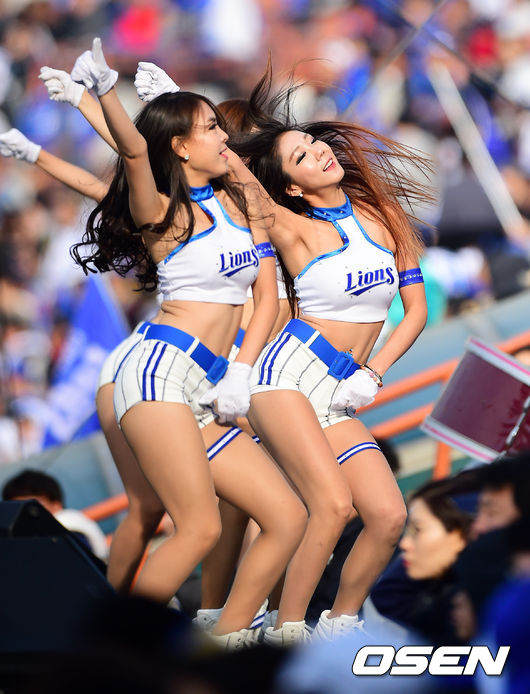 8일 오후 서울 목동야구장에서 열린 '2014 한국야쿠르트 세븐 프로야구 포스트시즌' 넥센 히어로즈와 삼성 라이온즈의 한국시리즈 4차전, 삼성 치어리더가 열띤 응원을 하고 있다.