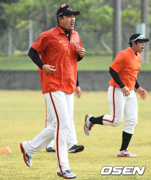 8일 일본 오키나와 고친다 구장에서 한화 이글스 2014 마무리 캠프가 진행됐다. 김태완이 빗속에서 런닝훈련을 하고 있다.