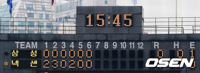8일 오후 서울 목동야구장에서 열린 '2014 한국야쿠르트 세븐 프로야구 포스트시즌' 넥센 히어로즈와 삼성 라이온즈의 한국시리즈 4차전, 6회까지 퍼펙트 행진 기록한 넥센 선발 밴헤켄, 전광판에 넥센의 안타수는 7개인 반면 삼성은 0.