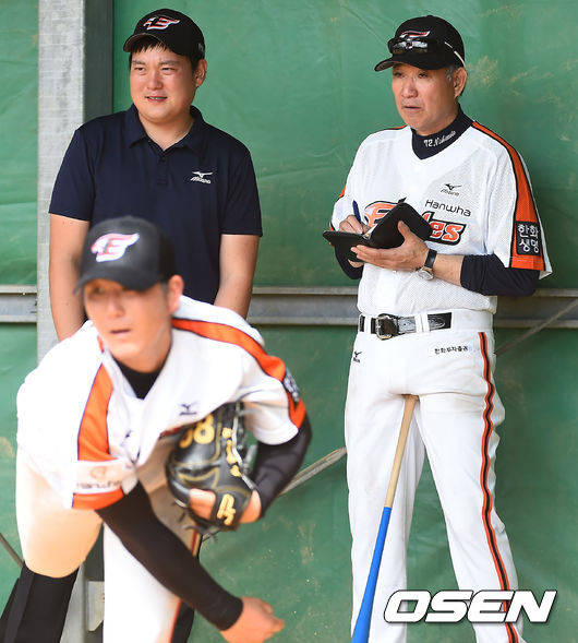8일 오전 일본 오키나와 고친다 구장에서 한화 이글스 2014 마무리 캠프가 진행됐다. 오늘 훈련에 합류한 니시모토 코치가 조영우의 투구를 보며 노트를 적고 있다.