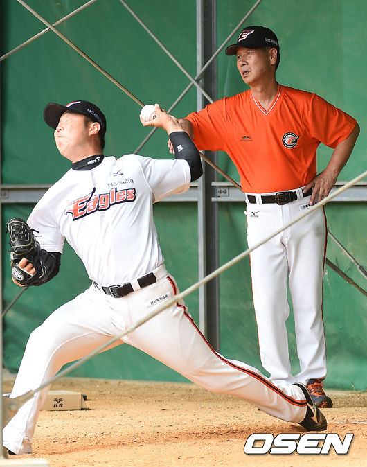 8일 오전 일본 오키나와 고친다 구장에서 한화 이글스 2014 마무리 캠프가 진행됐다. 김성근 감독이 불펜에서 지도를 하고 있다.
