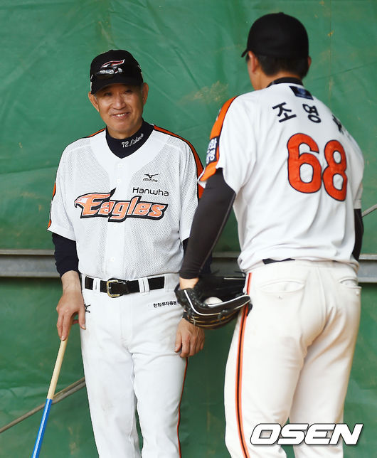 8일 오전 일본 오키나와 고친다 구장에서 한화 이글스 2014 마무리 캠프가 진행됐다. 오늘 훈련에 합류한 니시모토 투수 코치가 조영우에게 말을 하고 있다.
