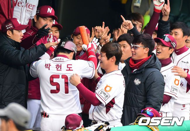 8일 오후 서울 목동야구장에서 열린 '2014 한국야쿠르트 세븐 프로야구 포스트시즌' 넥센 히어로즈와 삼성 라이온즈의 한국시리즈 4차전, 8회말 1사에서 대타로 나선 넥센 박헌도가 솔로포를 날리고 동료선수들과 기뻐하고 있다.